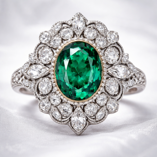 A pink gem sparkling with tons of diamonds and silver carvings around It