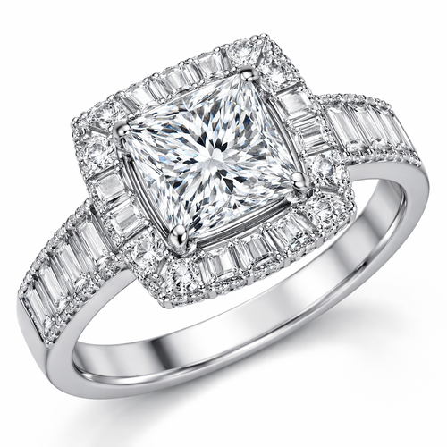 Create a ring halo style with 2ct flawless princess cut diamond stone in the center and .25 baguette cut diamonds surrou...