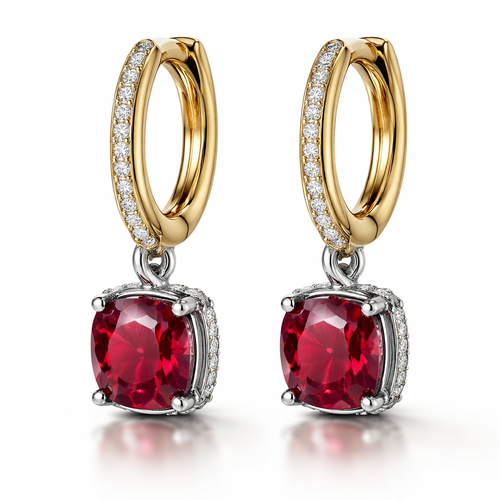 “Design a pair of luxury earrings featuring a warm gold hoop and a dangling cushion‑cut gemstone set in a cool‑toned met...