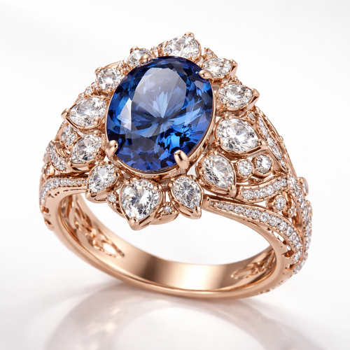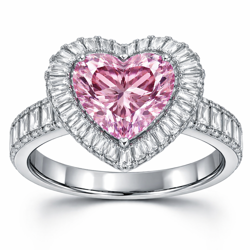 Create a ring halo style with 2ct flawless heart shaped pink diamond stone in the center and .25 baguette cut diamonds s...