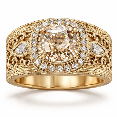 Old mine champagne diamond ring with broad band in light yellow gold , with vintage element