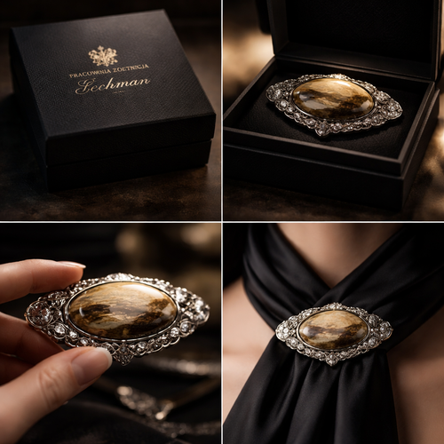 Elegant luxury jewelry video, slow cinematic movement. A decorative black jewelry box with gold logo "Pracownia Złotnicz...