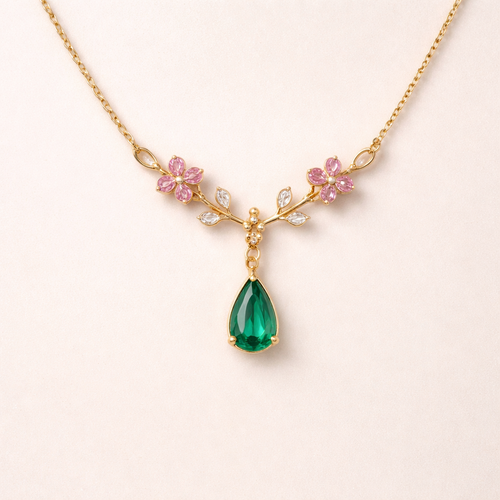 gold green emerald teardrop with pink sapphire flowers necklace
