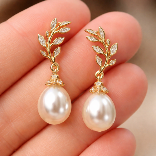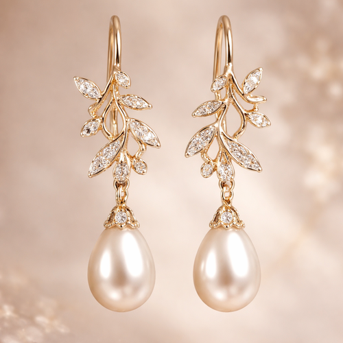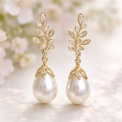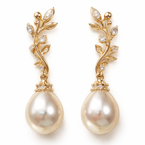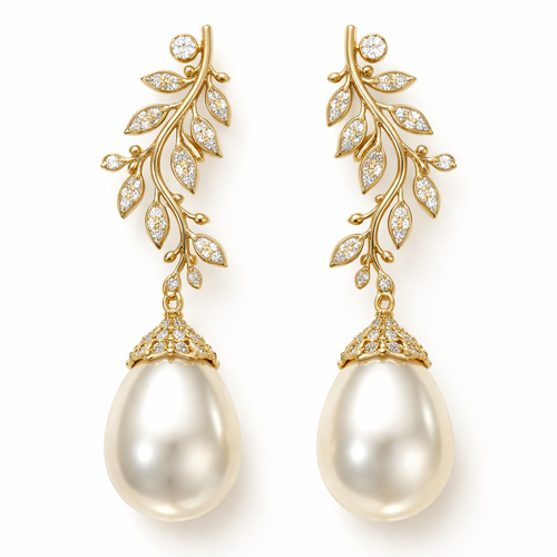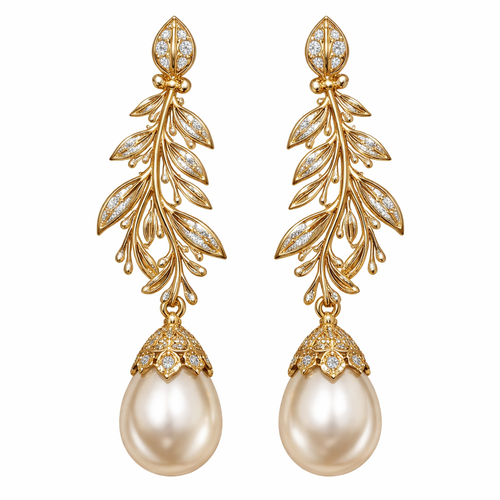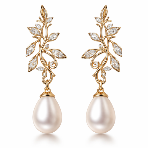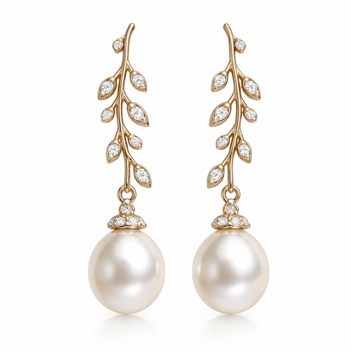 Gold pearl drop earrings with an olive branch and vine design and small white diamonds