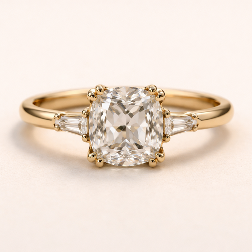 Gold band not thick but not thin. 2.5 carat old mine diamond but rectangle with rounded corners . 2 very small baguettes...