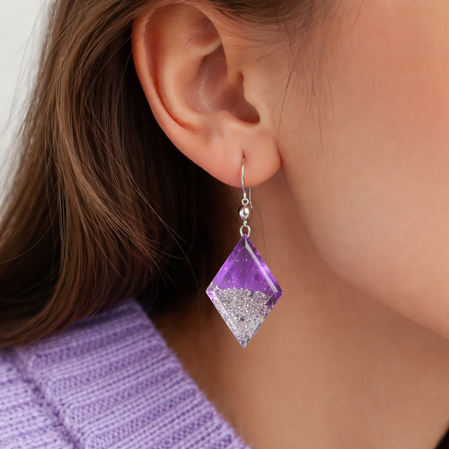 A picture that shows A woman’s half ear wearing purple sweater wearing Diomand shaped half purple and half glittery re...