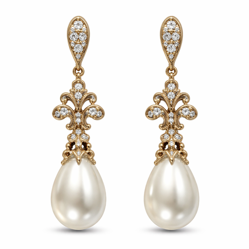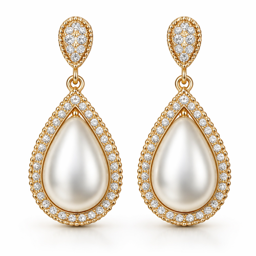 Pear shaped pearl drop earrings with gold border and with pavé diamonds, everyday wear