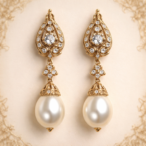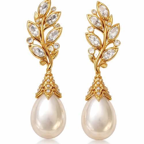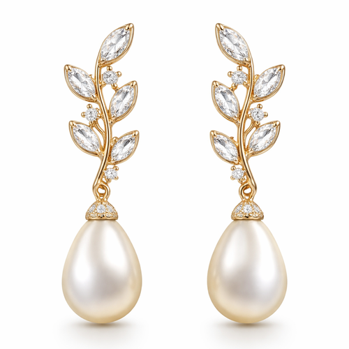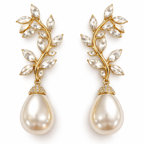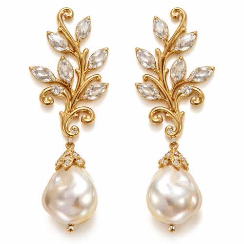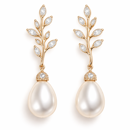 Gold pearl drop earrings with white sapphire stones and make it look like a olive branch