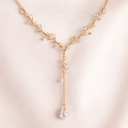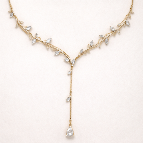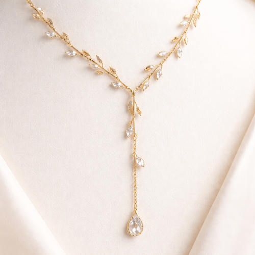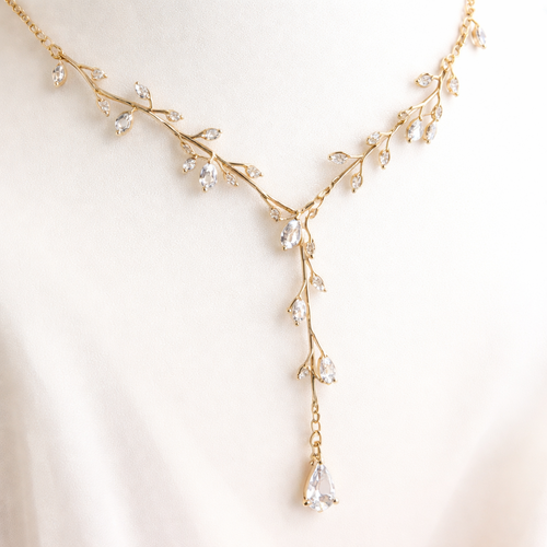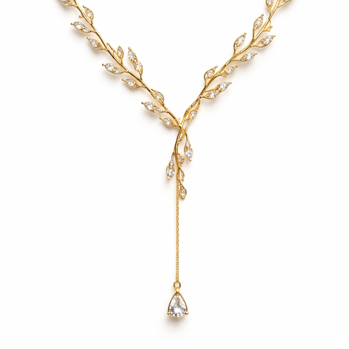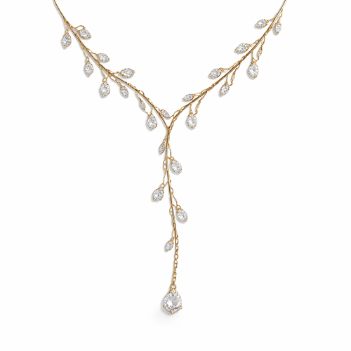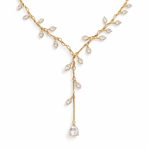 Thin Gold chain with thin wire wrapped around it like an olive branch and small pear cut white sapphire stones placed th...