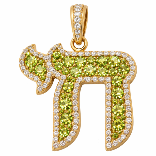 Gold Hebrew Chai pendant with pavé peridot and diamond stones