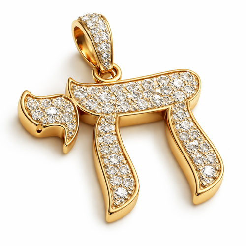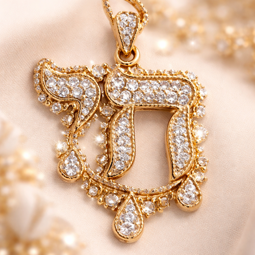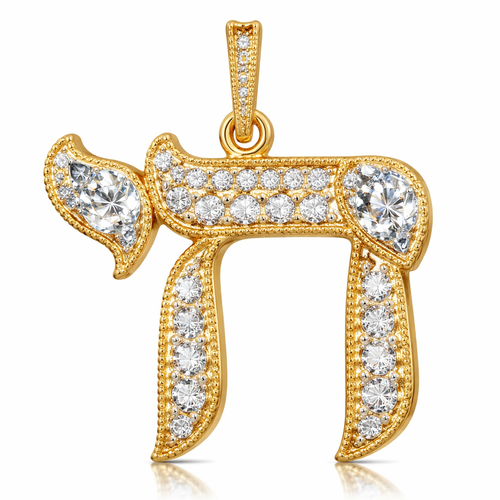 Gold Hebrew Chai pendant with pavé periods and white sapphire stones