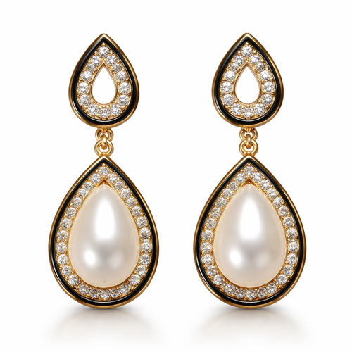 Pear shaped pearl drop earrings with gold and black border and with pavé diamonds, everyday wear