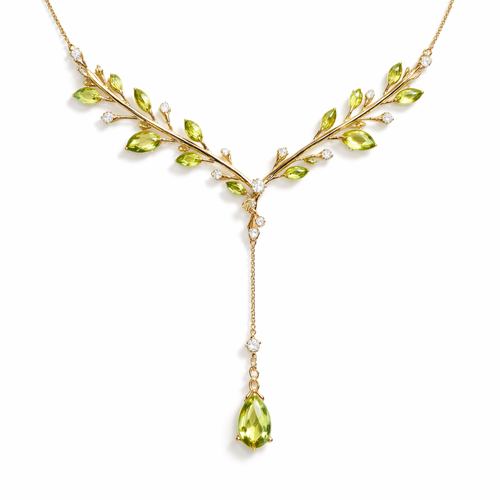 Thin Gold chain with thin wire wrapped around it like an olive branch and small pear cut bright peridot and diamond ston...