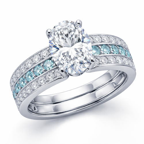 3ct solitaire oval diamond with triple channel set band with diamonds and aquamarine