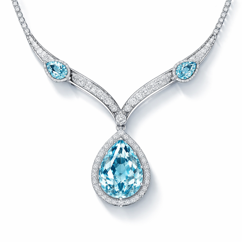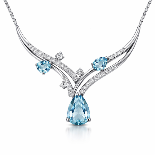 A modern women's necklace made of silver with diamond and aquamarine stones suitable for engagement