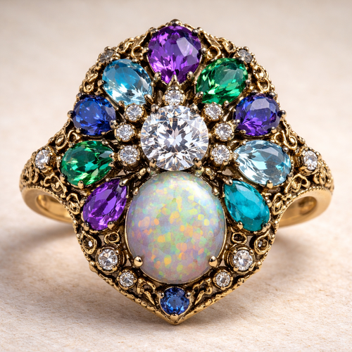 A vintage women's ring with diamond and amethyst and opal and sapphire and emerald and turquoise and aquamarine stones