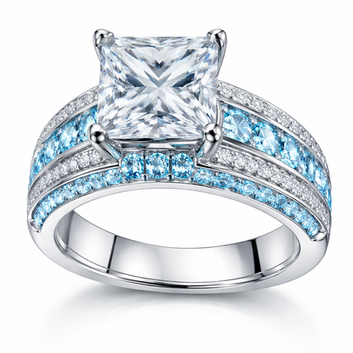 3ct solitaire princess diamond with channel set band with diamonds and aquamarine
