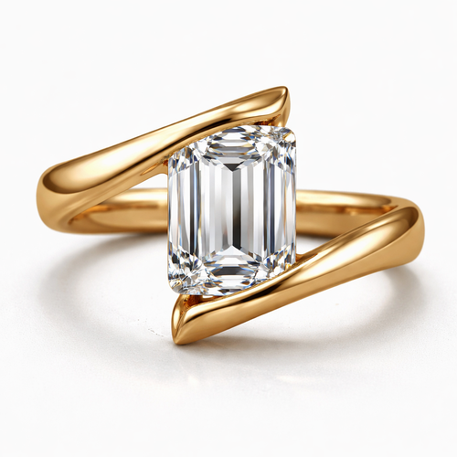 Emerald cut diamond with gold bypass ring