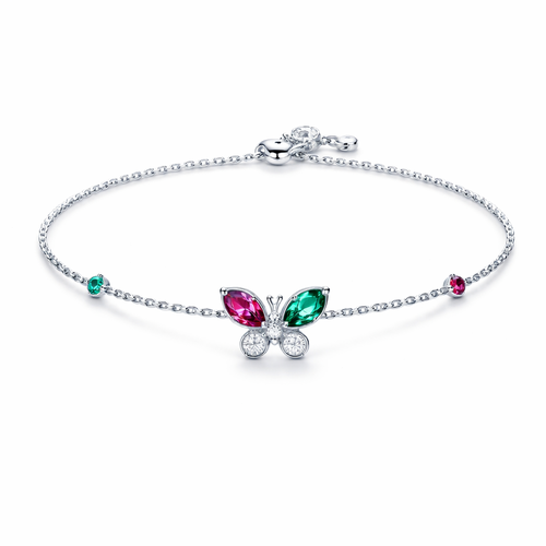 A minimalist women's anklet made of silver with diamond and ruby and emerald stones. butterfly attach with it and in tha...
