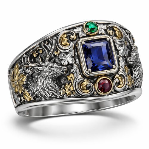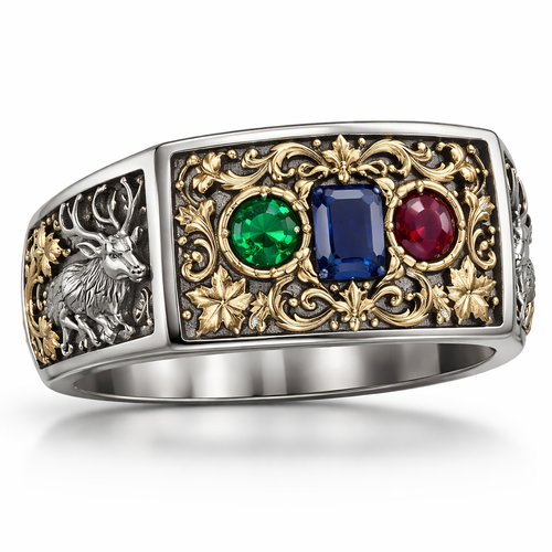 A modern men's ring made of mixed metal with sapphire and emerald and garnet stones suitable for daily wear. utilise la ...