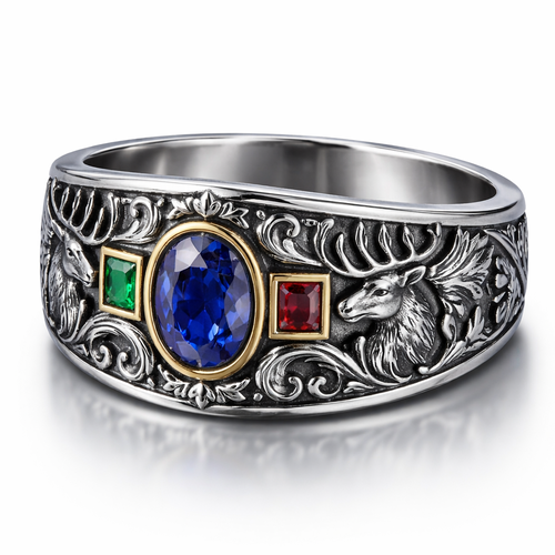 A silver men's ring made of mixed metal with sapphire and emerald and garnet stones suitable for daily wear. utilise la ...