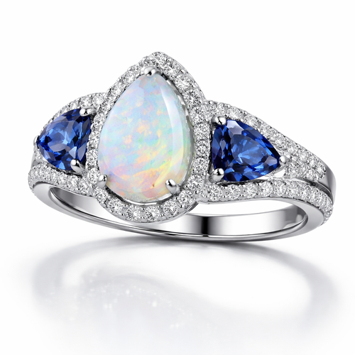 A modern women's ring made of silver with diamond and opal and sapphire stones suitable for engagement