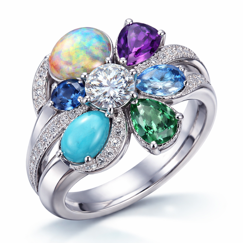 A modern women's ring with diamond and amethyst and opal and sapphire and emerald and turquoise and aquamarine stones