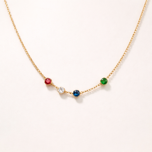 A minimalist women's necklace made of gold with ruby and diamond and sapphire and emerald stones