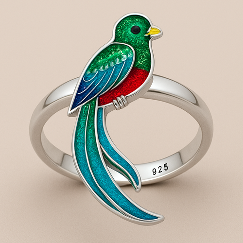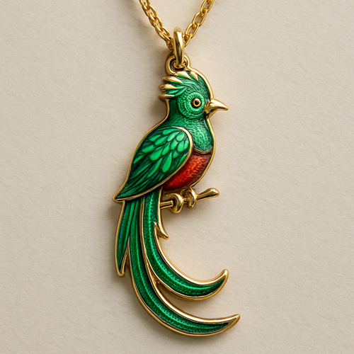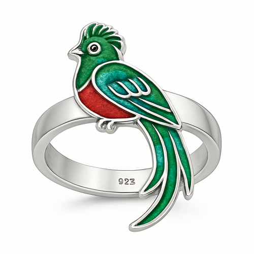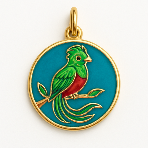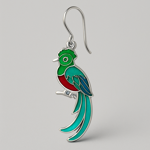 Placa de plata con quetzal, con tres colas enamel diamante la cola de el quetzal