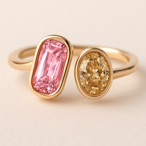 toi et moi baby pink elongated radiant diamond and champagne colored oval diamond both bezel