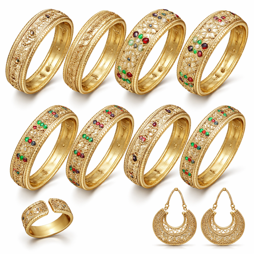 Six gold bracelets with intricate Mauritanian geometric patterns, two with fine line details, two with star shapes, two ...