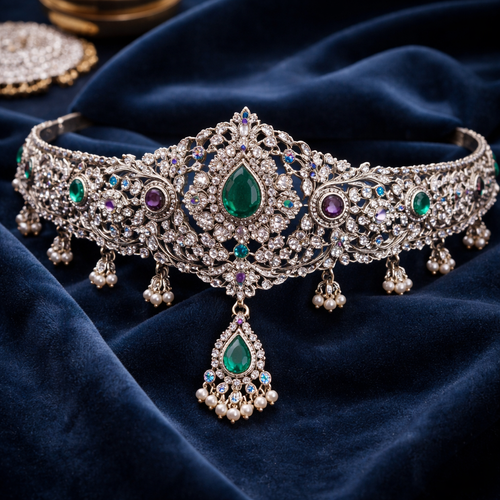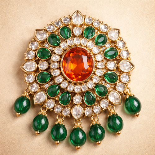Create a Kundan jewellery with orange stone at the centre and green stone at the next row white small stone’s in between...