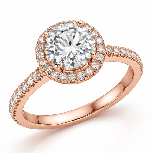 rose gold ring with 2 carat diamonds with small diamonds around the solitaire