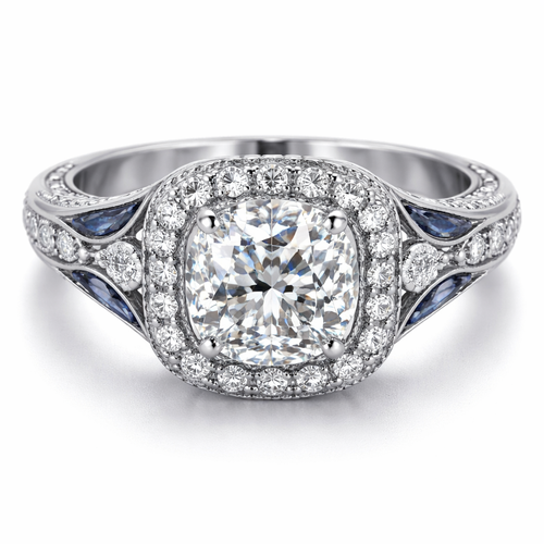 Center stone: 1 round diamond (~0.20 ct), set high on prongs • Side stones: • 1 blue sapphire (~0.05 ct) on the left ...