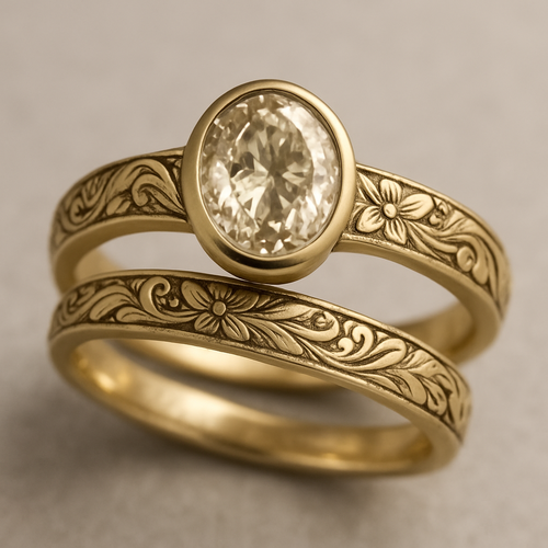 flower/leaf design hand engraved vintage/whimsical inspired 6ct oval engagement ring with matching band