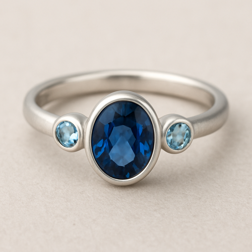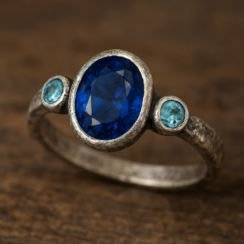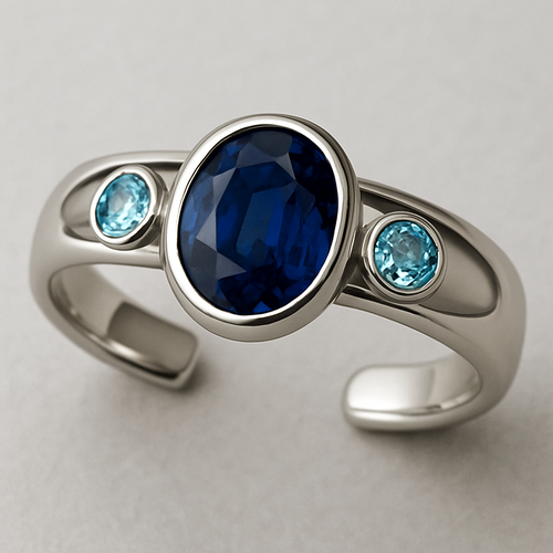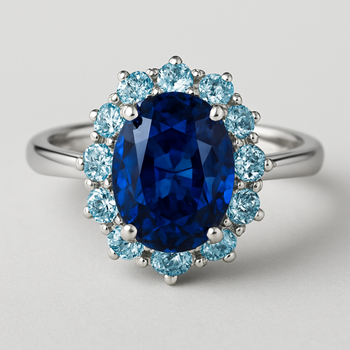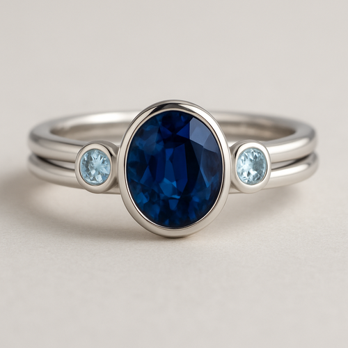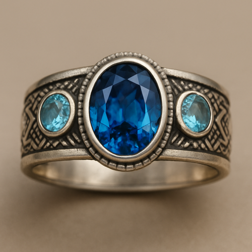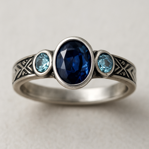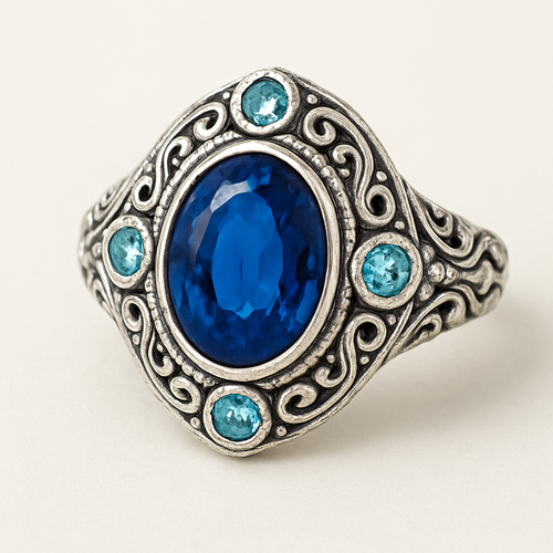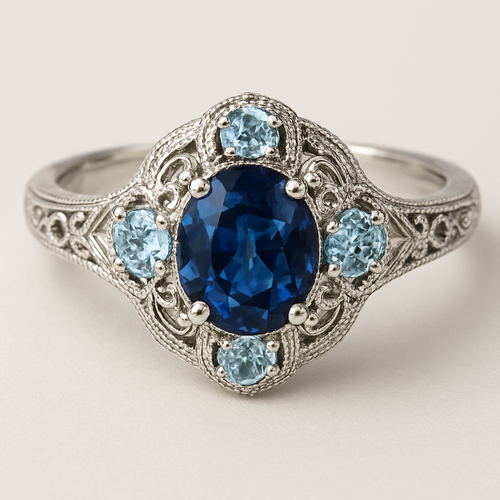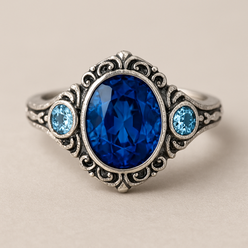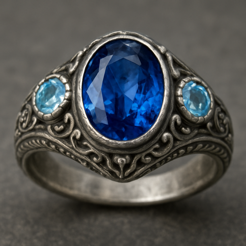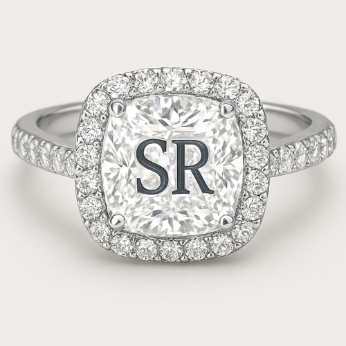 Cushion shape with diamonds centre of the ring with letter SR and side of the ring stones