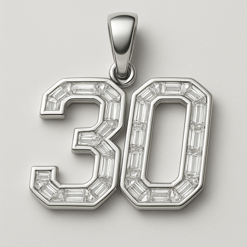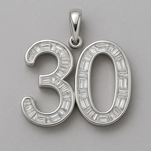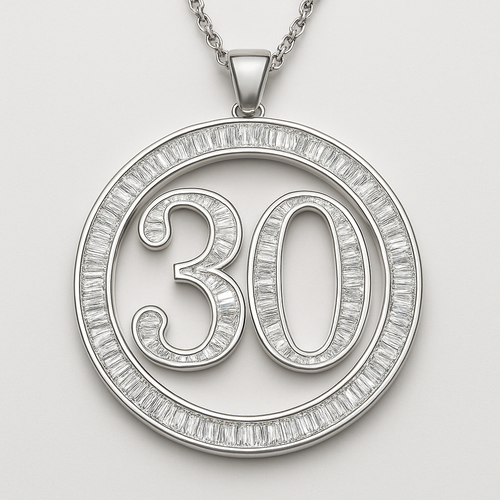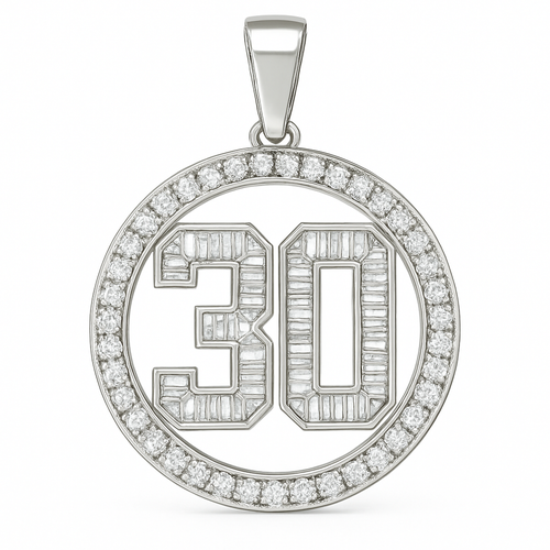 Number 30 with white gold baguettes inside 3.5 inch circle pendant , big graphic font