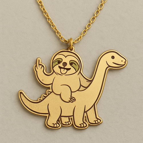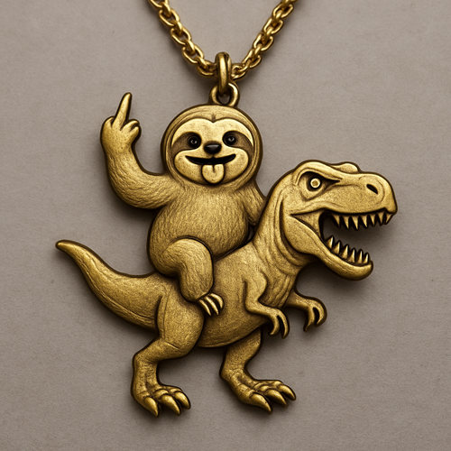 Iconic sloth flipping the bird while sticking out tongue and winking eye while riding a dinosaur pendant necklace