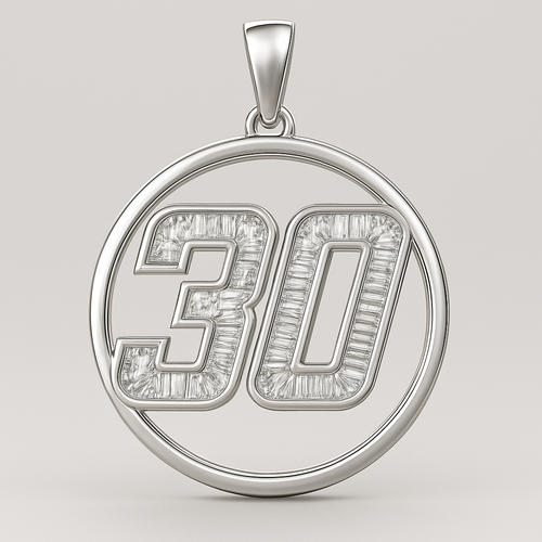 Number 30 with white gold baguettes inside big circle pendant , big nascar font