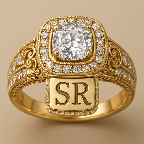Cushion shape with diamonds centre of the ring with letter SR on gold ring