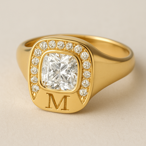 Cushion shape with diamonds centre of the ring with letter on gold ring