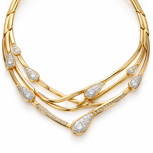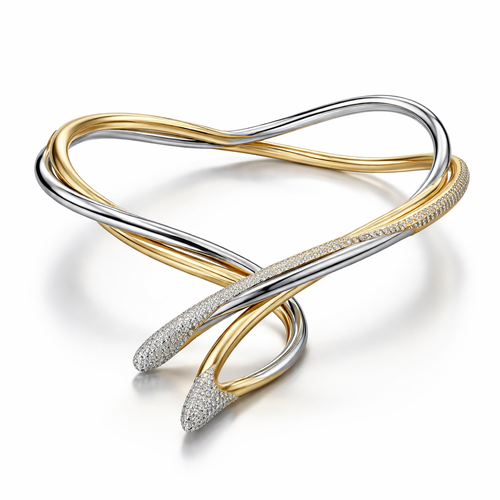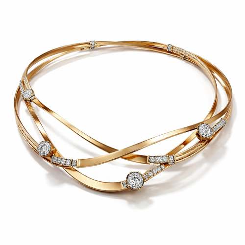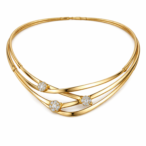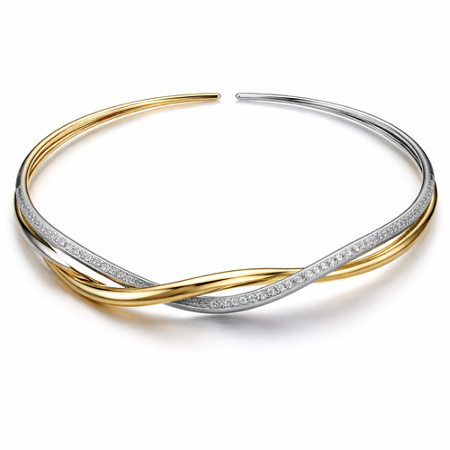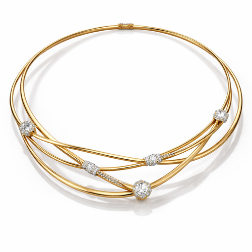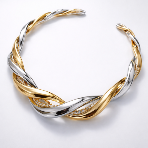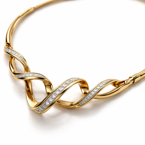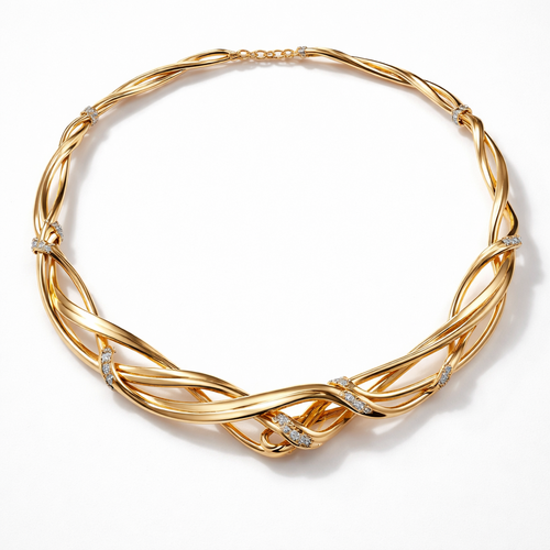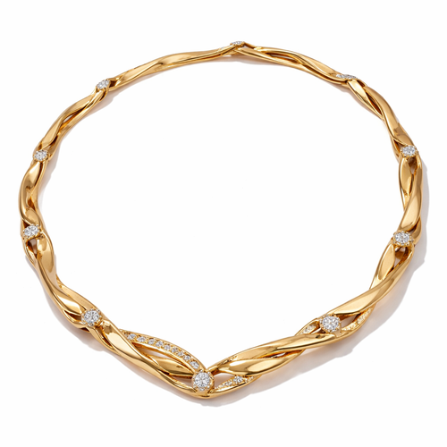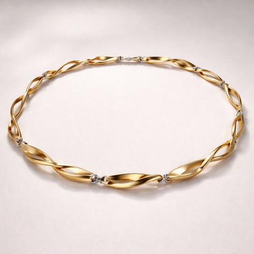 A necklace made of one flat wire that is twisted 3 times with links n articulations and gold n diamond
