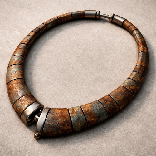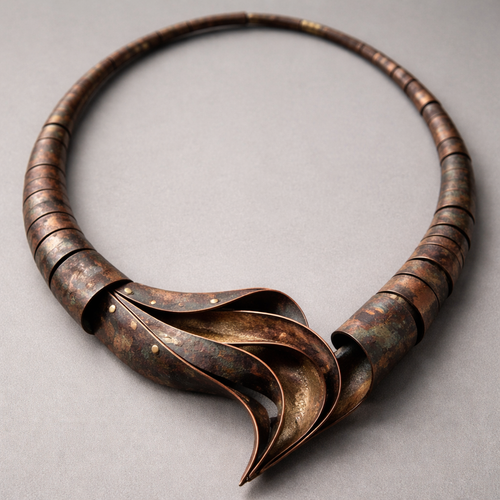 A necklace made of one flat wire that is twisted 3 times around itself with links n articulations that makes it flexibl...