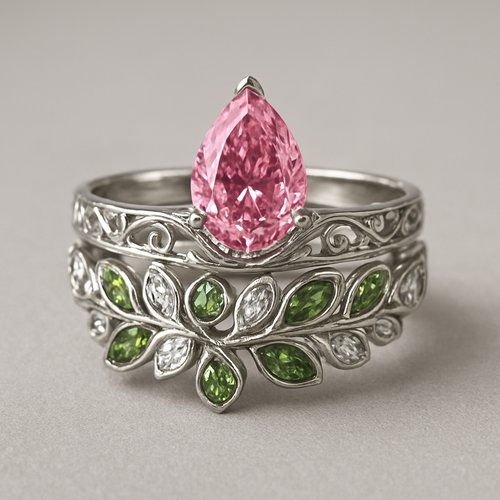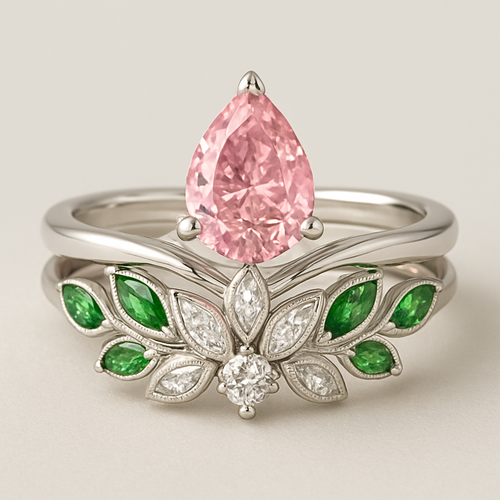 Two 18k white gold bands: first one a 1.5-2 carat pear cut pink diamond. Second ring as the bottom of the stack, will ha...