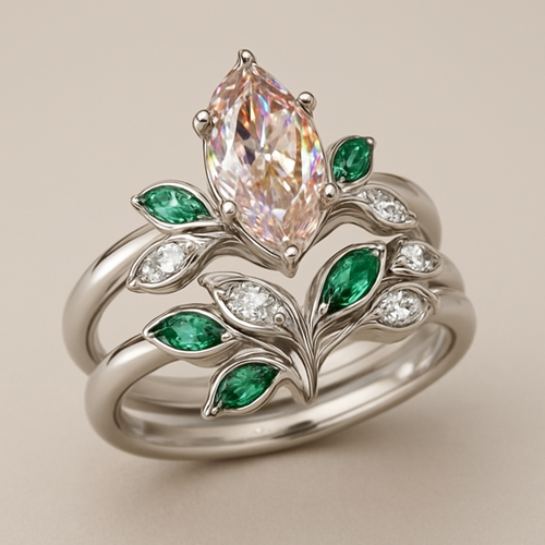 18k white spiraled gold bands: first one a 1.5-2 carat marquis cut multi color diamond. Second ring as the bottom of the...