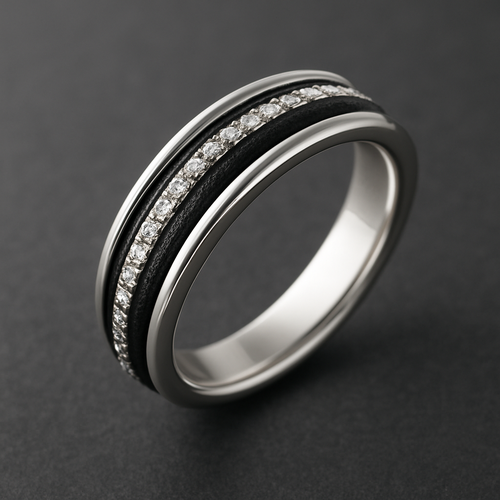 Silberner Ring mit dünnen Lederband in Silbergerüst mit Diamanten besetzt eingearbeitet