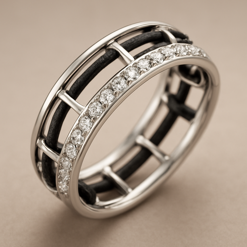 Silberner Ring mit dünnen Lederband wellenförmig eingefädelt in Silbergerüst mit Diamanten besetzt eingearbeitet