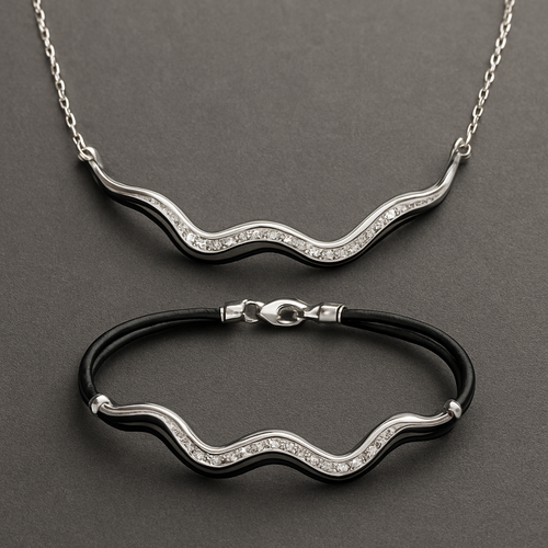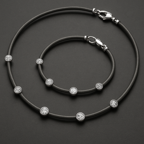 Silberner Kette und Armband mit dünnen Lederband wellenförmig eingefädelt in Silbergerüst mit Diamanten besetzt eingear...