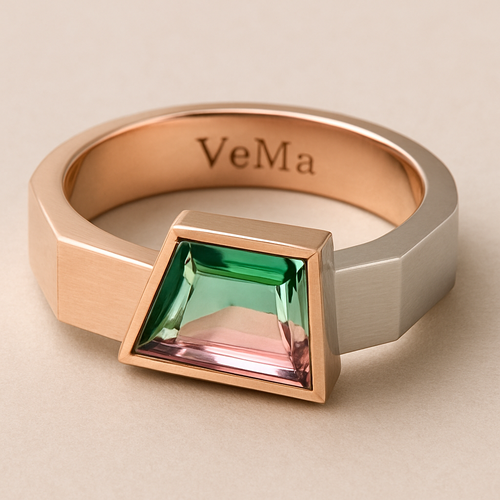 Eckiger Ring 1cm breit in rosé mit einem Diamanten in Form eines Trapez in grün und rosa innen Gravur VeMa
