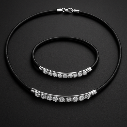 Kette und Armband Dünnes Lederband in Silbergerüst mit Diamanten besetzt eingearbeitet